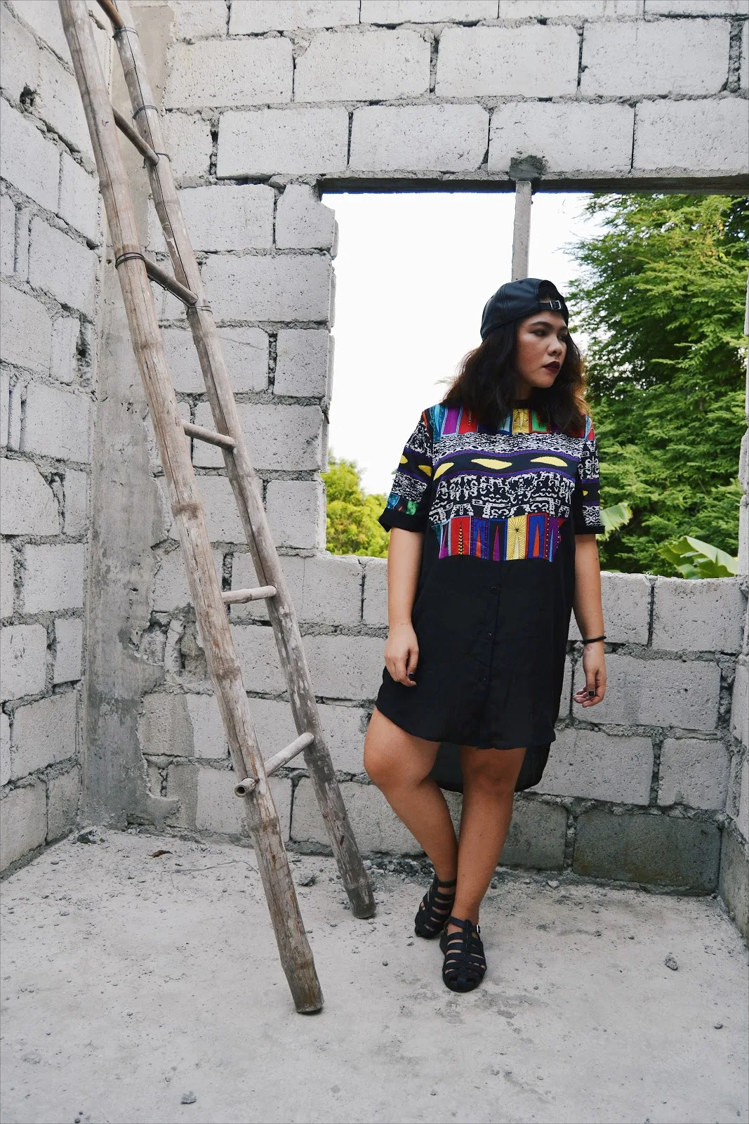 First, is this T-shirt dress with colorful print. What I love about this is that it is a combination of a shirt and a button up, oh a dress too! I styled it with my black leather cap, I am so surprised with the good leather material and cap form is sturdy. To keep the black scheme, I am wearing my trusty old gladiator.
